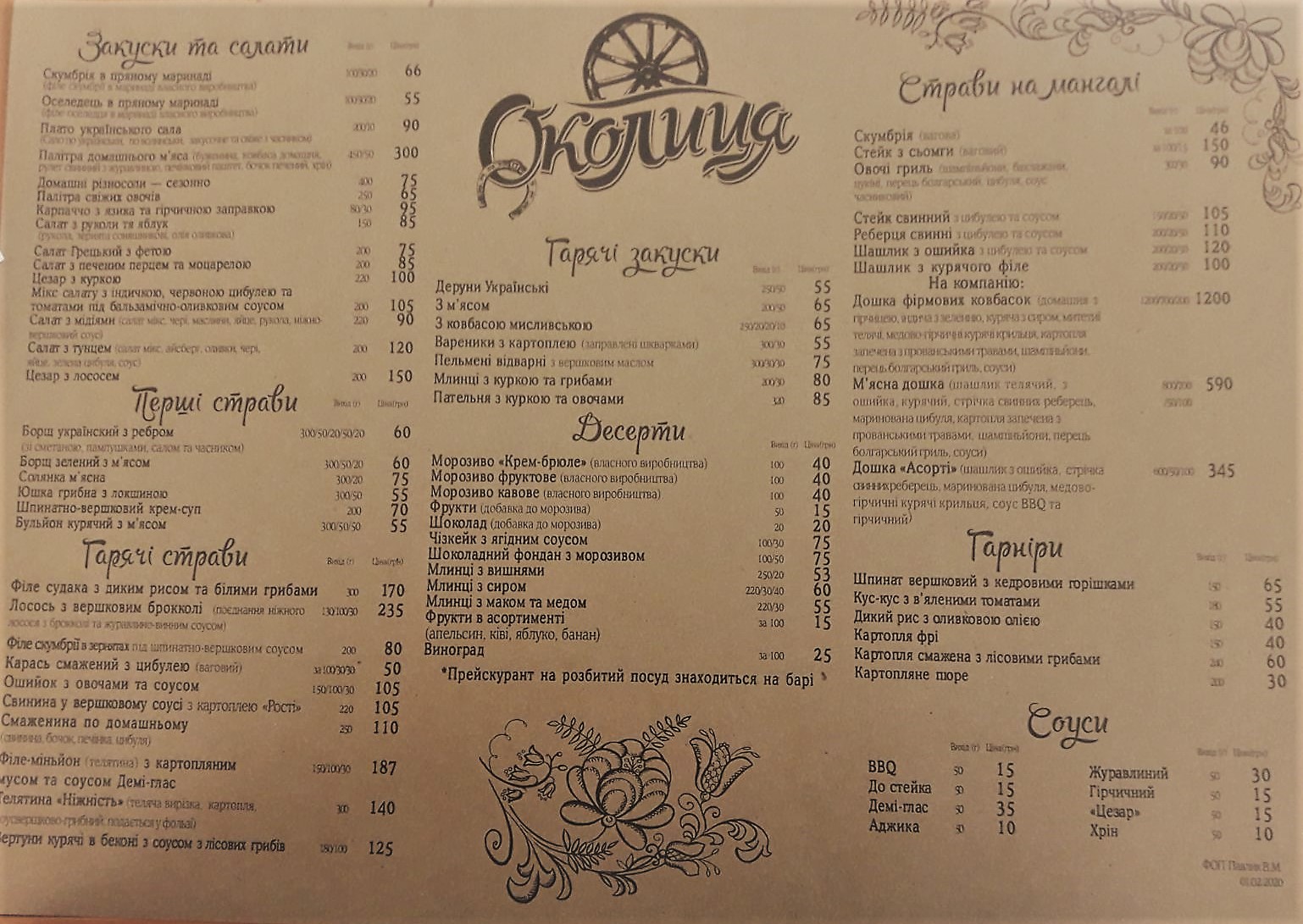 Неповторну атмосферу та колорит старовинного пишного заміського будинку можна відчути в готельно-ресторанному комплексі «Околиця». Стильне оформлення закладу, зручні та просторі бенкетні зали та колиби, привітний та уважний персонал забезпечать проведення свята на високому рівні.
